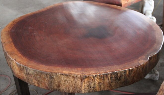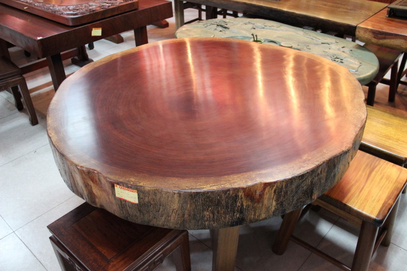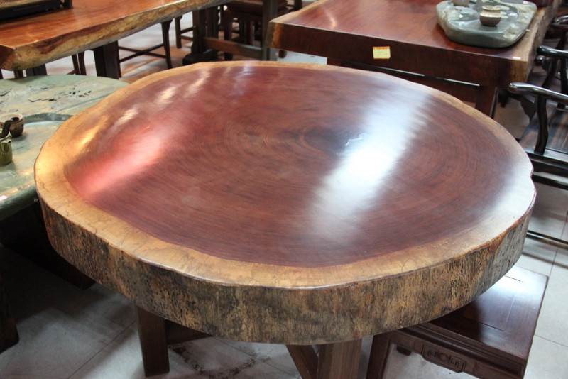 * **Organic Shape:** The "slab" construction means the table retains the natural shape of the tree trunk. In a round table, this creates a beautiful, organic circle or oval, often with unique bumps, curves, and the characteristic live edge on the circumference.