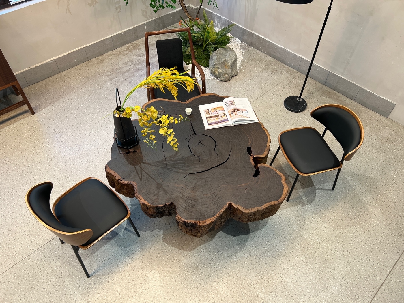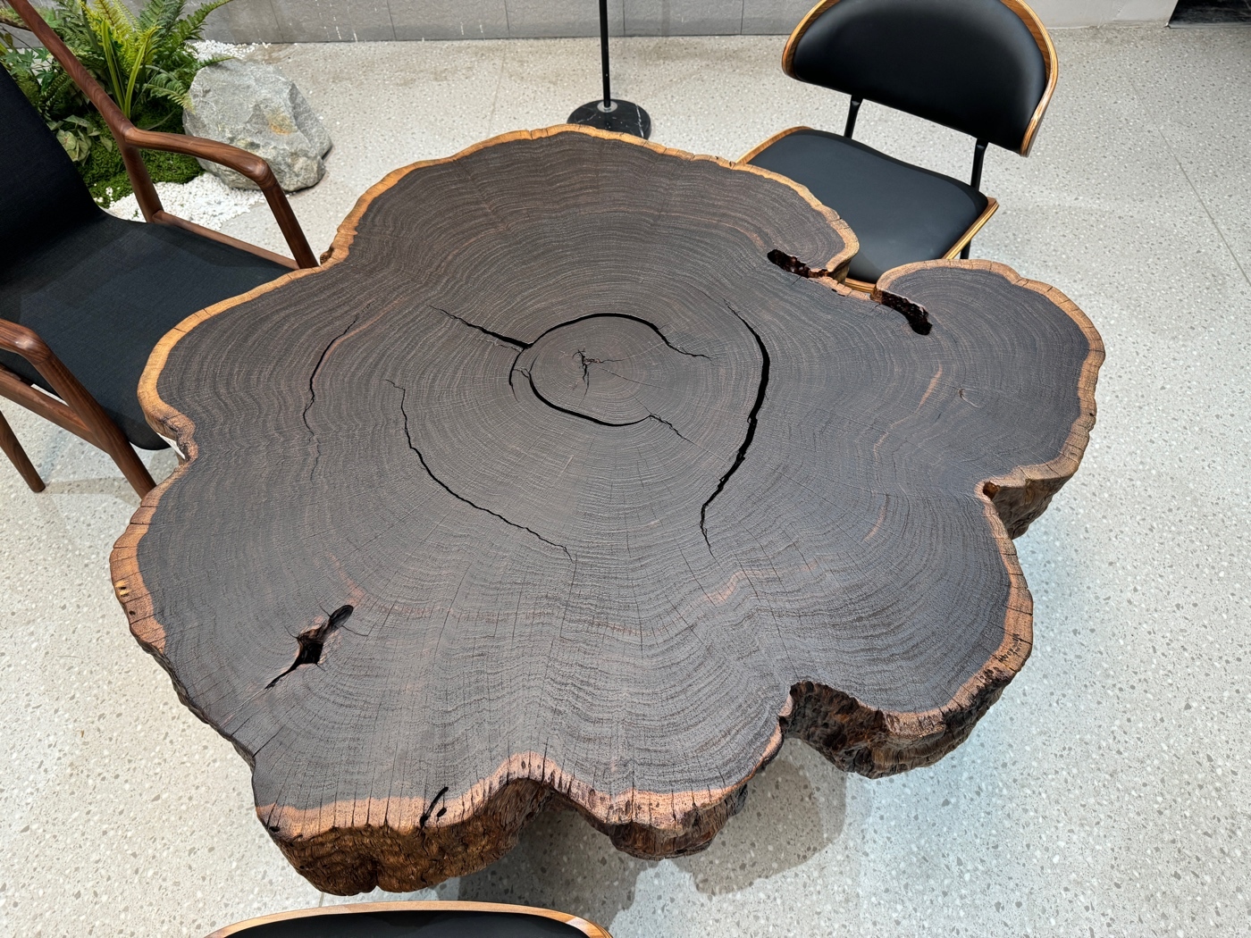 Nous sommes convaincus qu'un matériau aussi puissant mérite un design qui le sublime, sans le concurrencer. La table basse Annual Ring se distingue par son piètement épuré et minimaliste – disponible en fer forgé pour une touche industrielle ou en bois aux tons doux pour une fluidité organique – qui met en valeur le plateau sans détourner l'attention de son essence. Notre philosophie est simple : laisser le bois s'exprimer.